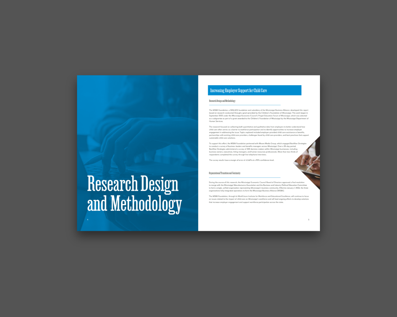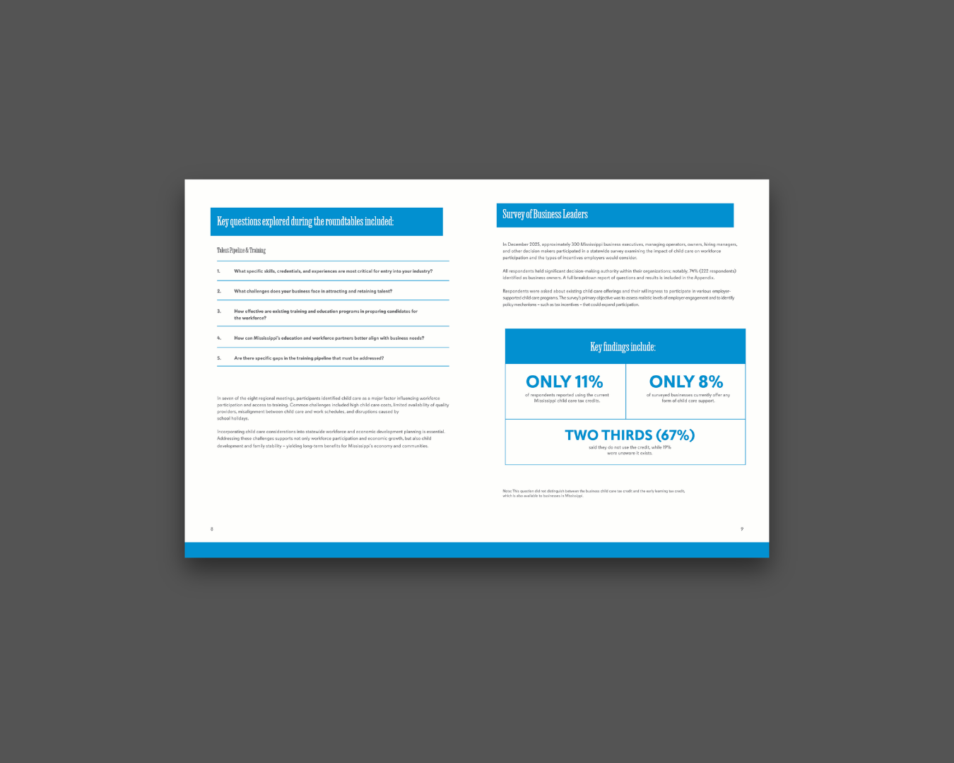 From late 2025 through early 2026, Moore Media Group partnered with the Mississippi Business Alliance Foundation to conduct polling research about this important issue, seeking to better understand how child care affects Mississippi’s workforce and what role employers might play in addressing the issue. The report contained reliable data from business leaders across the state and helped create actionable recommendations for lawmakers. After research was concluded, we designed the final report into an engaging and educational printed piece ready for distribution. Research was conducted through a grant from the Children’s Foundation of Mississippi funded by the Mississippi Department of Human Services,
